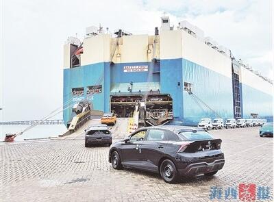 在廈門現(xiàn)代碼頭,一批上汽純電動(dòng)汽車駛?cè)霛L裝船。